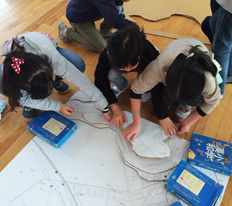 自分の住んでいるエリアの地図が印刷された段ボールジオラマをみんなで組み立て、楽しみながらまちの地形や災害リスクを学ぶことができます。