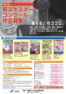 内閣府では、防災意識のより一層の高揚を図るため、防災に関するポスターデザインを広く一般から公募を行う「防災 ポスターコンクール」を実施しています。昨年度行ったコンクールにおいて、入賞した作品を展示します。 また、本年度行う32回コンクールの募集ポスターを掲示します。