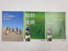 東日本大震災の発災以来、国内外からたくさんのご支援をいただきながら、仙台市は様々な事業に取組み、復興に向けての歩みを進めてきました。この間の取組みをパネルでご紹介するほか、本市復興の原動力となった市民や地域団体・NPO、企業やボランティアなど多様な主体の活動を紹介する記録誌などを配布します。